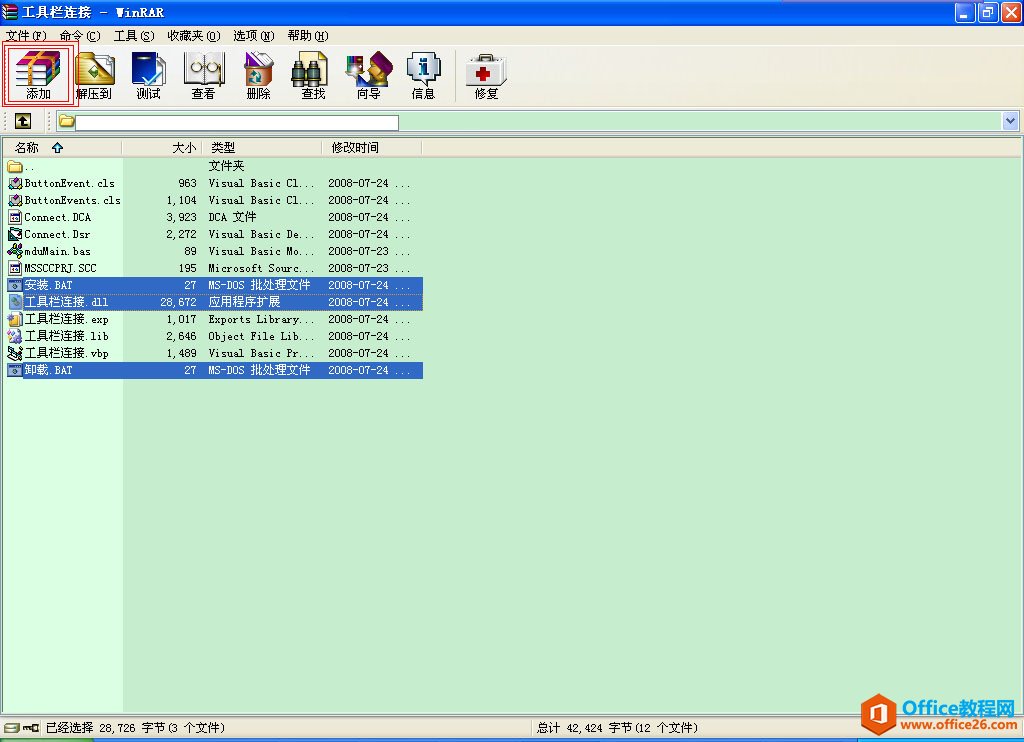 打开“WinRAR”,定位到生成的DLL文件的目录。选中要DLL文件、安装和卸载两个BAT文件、被工程引用项目的文件等。按“添加”。