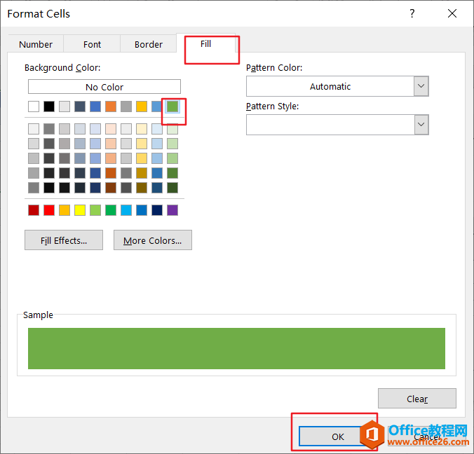 步骤4:单击格式按钮,将打开设置单元格格式对话框。切换到“设置单元格格式”对话框中的“填充”选项卡,然后选择一种颜色作为背景颜色。然后单击确定按钮。