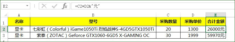 最后,再来一个Excel函数公式连接字符串的真实场景:E2单元格进行合计的时候,需要加上单位元,公式为:=C2*D2&"元"。