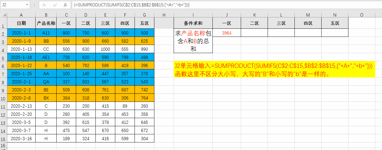 在J2单元格输入=SUMPRODUCT(SUMIFS(C$2:C$15,$B$2:$B$15,{"*A*","*b*"})),按CTRL+Shift+回车,完成数组求和。字母B和b是一样的,不区分大小写。