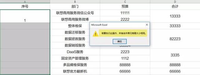 如果按照正常的下拉表格填充序号,Excel会拒绝填充并向你扔一个单元格大小不同无法填充的提示~