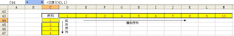 我们在实际工作中,经常会生成下图所示这样的序列,其方法就是在:D43和C44单元格分别输入:=SUM(C43,1),然后分别向右向下拖动复制,即可生成序列。本公式是利用了EXCEL在求和时,会自动忽略文本的原理实现。