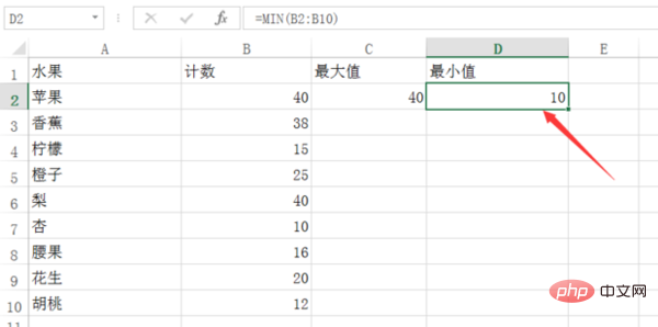 1、最小值和最大值类似,同样在编辑栏先输入=,接着输入函数MIN(要大写),在函数中输入范围如下图: