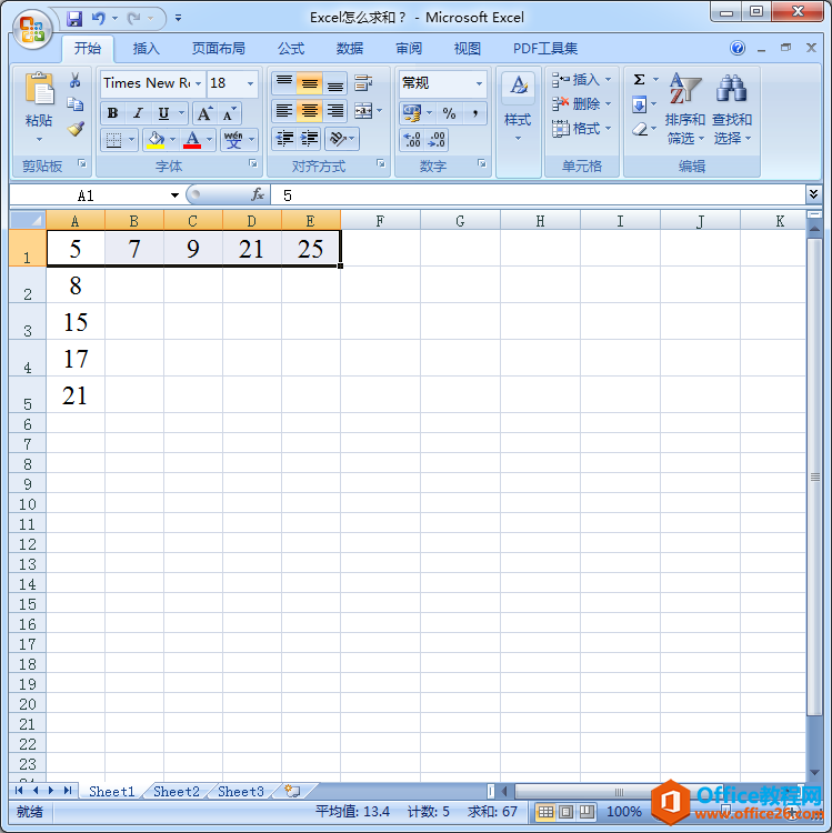 第二步:点击『开始』功能菜单,然后选择『求和(S)』功能,便可以求和第一行5个数字的和(同样,第一列5个数字求和的方法也是一样的)。