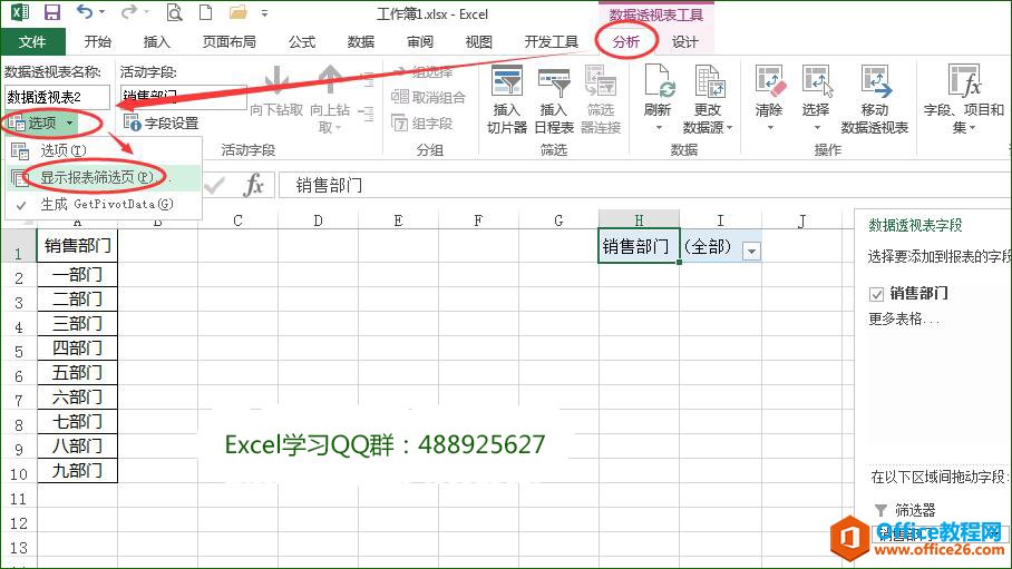 第三步,依次执行“数据透视表工具——分析——选项——显示报表筛选页”。