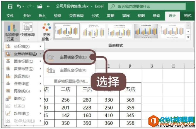 选择图表,单击【图表工具】➢【设计】选项卡下【图表布局】选项组【添加图表元素】按钮的下拉按钮,在弹出的下拉列表中选择【坐标轴标题】➢【主要横坐标轴】选项。使用同样的方法选择【主要纵坐标轴】选项。