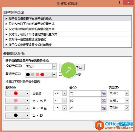 紧接着,在新弹窗口中设置“格式样式”为图标集。图标样式如下图所示。(下图2处)
