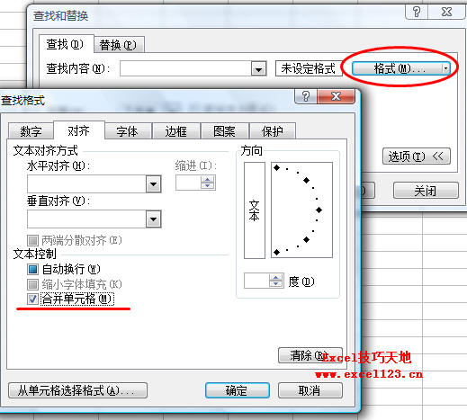 2.单击“格式”按钮,打开“查找格式”对话框。选择“对齐”选项卡,勾选“合并单元格”,单击“确定”按钮。