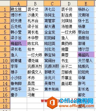 如果要比较Excel工作表的许多列,高亮显示其中相同的内容,可以用条件格式的方法。例如在A1:E18区域中包含六列名单,现在要在整个区域或其中几列中找出重复值。