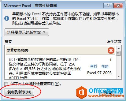 说明:由于Excel2007以上版本“*.xlsx”类型工作簿中工作表的列数有16384之多,而Excel97-2003类型(*.xls)工作簿中工作表包含的列数只有256列,而上述公式所引用的的单元格ZZ1所在列为702列,超出了Excel97-2003类型(*.xls)工作表所支持的列数限制,故在进行兼容性检查时会给出提示。其中“ZZ1”单元格也可以其他用工作表引用范围内但超出256 (IV)列或65536行之外的某个单元格。