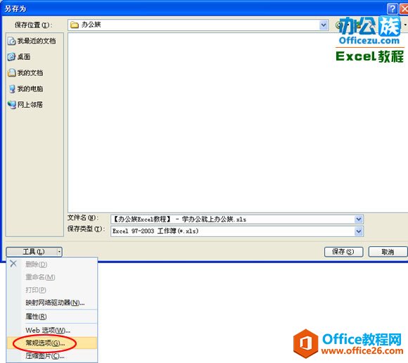 在弹出的“另存为”窗口中点击左下方的“工具”,在弹出菜单中选择“常规选项”;