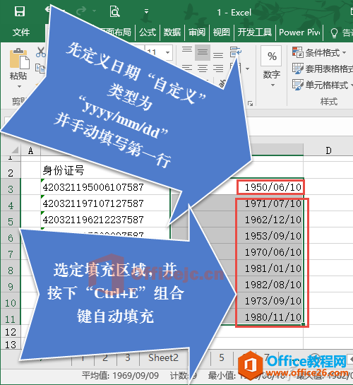 使用Excel 2016“快速填充”,在填充之前首先对目标列的格式进行设置。打开“设置单元格格式”对话框,切换到“数字”选项卡,选择“自定义”分类,在右侧的“类型”选择“yyyy/mm/dd”,确认之后关闭对话框。然后在目标单元格手工输入身份证号中的出生日期,选定需要快速填充的单元格区域,按下“Ctrl+E”组合键就可以看到如图所示的效果。