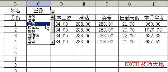 我们需要制作一个“个人工资表”来查看每个人每个月的工资情况,这时就可以制作一个包含员工姓名下拉列表,在其中进行选择来查看指定员工每个月的工资情况。