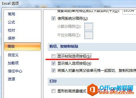 依次单击“OFFICE按钮→Excel 选项→高级”,在“剪切、复制和粘贴”区域中取消选择“显示粘贴选项按钮”。