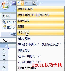 Excel可以记住操作步骤,并将这些操作记录到撤消列表中。如果在Excel中执行了某些错误操作,除了反复按快捷键Ctrl+Z来撤消多次操作外,还可以直接单击撤消按钮右侧的箭头,在弹出的下拉列表中选择到某个操作步骤,如图可以撤消最近的5项操作。