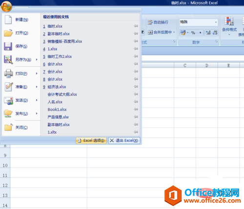2、点击【OFFICE按钮】,在弹出的选项中选择点击【EXCEL选项】按钮。