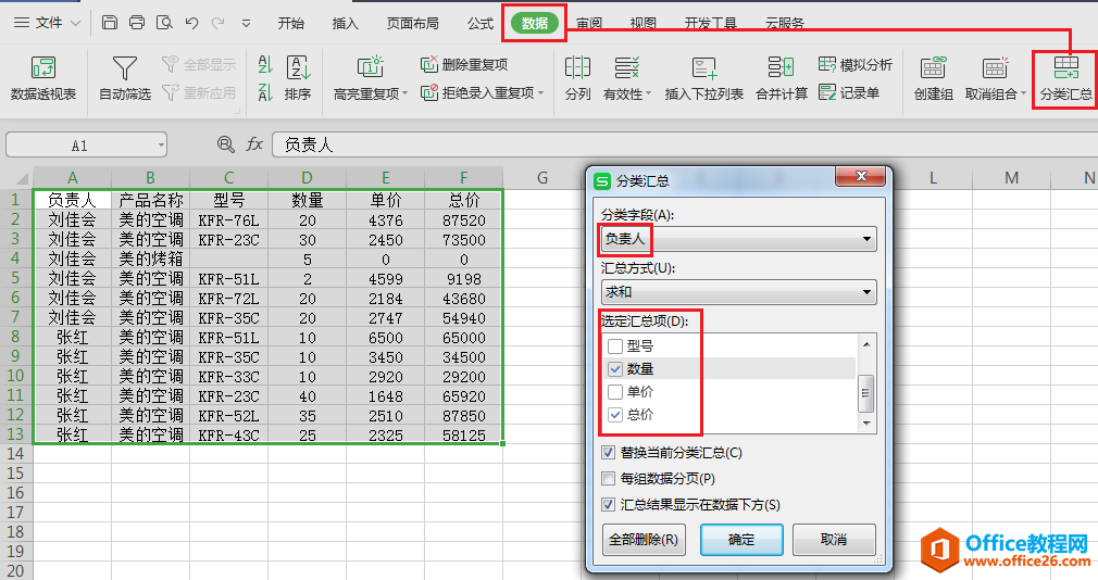 然后,我们选中任何一个单元格,点击数据菜单栏下的分类汇总工具选项,系统会弹出一个分类汇总的对话框,然后我们选择分类字段里的负责人,选定汇总项选择数量,总价,然后点击确定,如下图: