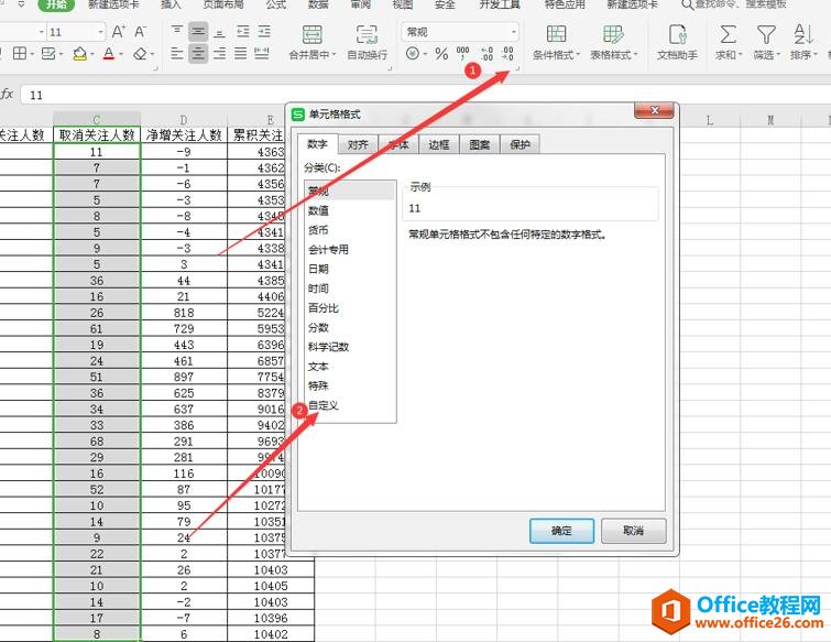第三步:点击【开始】选项卡中的数据格式,会出现一个弹出框,点击【自定义】: