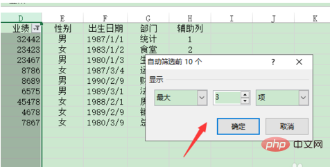 弹出“自动筛选前10个”对话框,在“显示”区域将筛选条件设置为