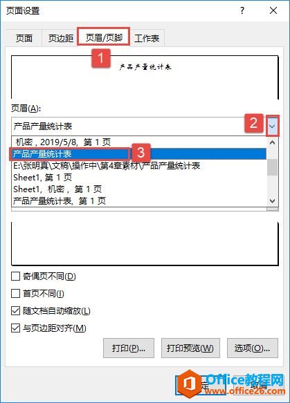 STEP02:在“页面设置”对话框中切换至“页眉/页脚”选项卡,单击“页眉”选择框右侧的下拉按钮,在展开的下拉列表中选择“产品产量统计表”选项,如图4-17所示。