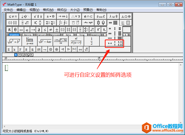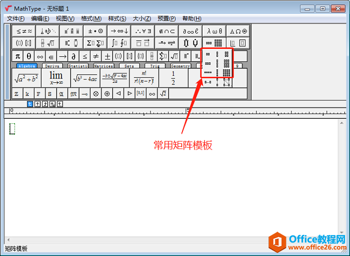 作为被广泛应用的数学公式编辑器,MathType的矩阵编辑功能也是十分全面的,小编这里使用的是MathType 7(Win系统)来做示范,使用比较频繁的2*2、3*3、4*4的常见矩阵可以直接使用MathType 7的自带模板。