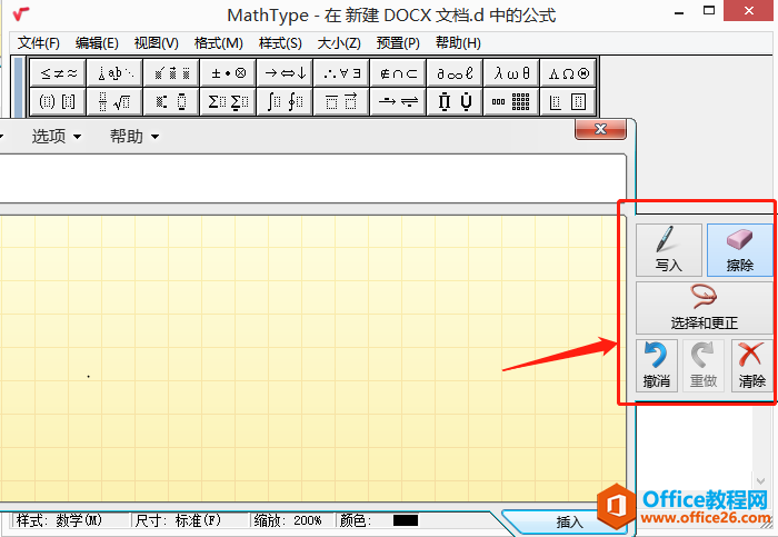 下面我们在面板中输入{EMBEDEquation.DSMT4},只要用鼠标点击数字面板一下,面板右边即出现六个功能。在这里我们点击手写,然后用鼠标移到面板中开始书写。MathType数字面板特别灵敏,你写了之后,面板上方或下方的白色区域会显示书写的内容。如图4,小编写了{EMBEDEquation.DSMT4}后,下方区域就显示了出来。