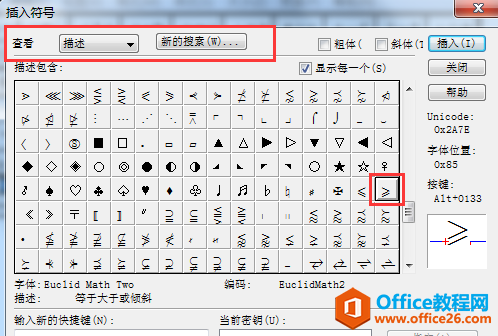 步骤二:随后会跳出一个“插入符号”的对话框。在“插入符号”对话框中,将“查看”的方式设置为“描述”,直接在下拉菜单中进行选择就可以了。在查看方式的下方会出现一个符号面板,在符号面板中拉动加边的滚动条来找到相应的符号,点击后进行插入,再关闭对话框就可以了。