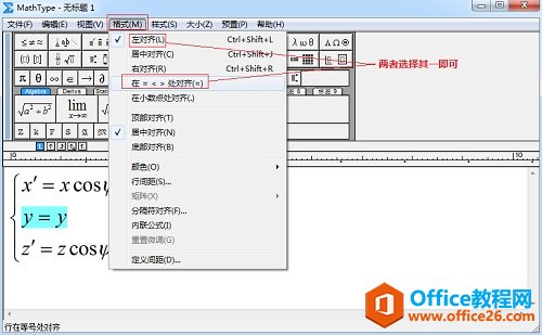 3.选中第二个公式,在格式菜单中选择“左对齐”或者“在=<>对齐”。方程组编辑完成,关闭保存即可。