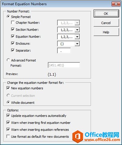 4.点选“Whole document”复选框,确保改变文档中所有等式序号格式,然后点击OK。你会注意到文档的序号格式已经改变,等式序号变为<1.2.1>,<1.2.2>等,这时因为在文档的起始处的章的分割为数值1,而节的起始值为2。我们此时假定章的起始值为2;