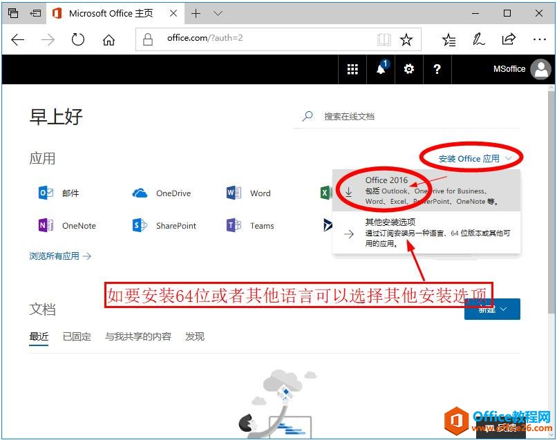2. 登录成功之后,点击右上角“安装office应用”,点击office2016即可下载安装,点击保存或另存为等待下载完成即可(如果需要安装64位或者其他语言,点击其他安装选项);