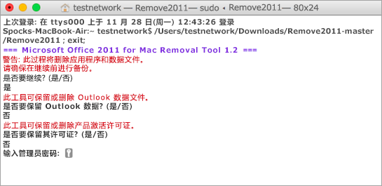 注意: 如果某 Office for Mac 2011 应用程序仍处于打开状态,则将显示一条警告。键入 Y,再按 enter 强制关闭该程序,然后继续卸载。