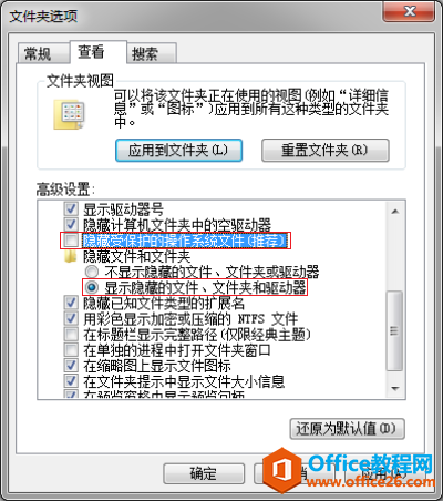 第一步:对『文件夹选项』进行设置,取消勾选『隐藏受保护的操作系统文件(推荐)』和勾选『显示隐藏的文件、文件夹和驱动器』;