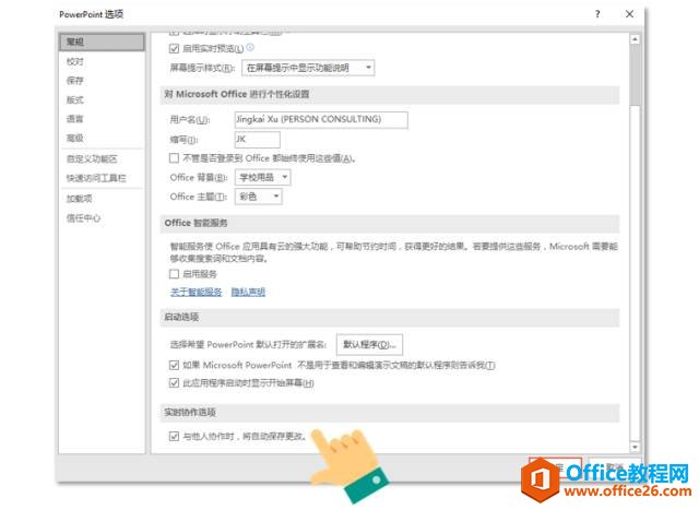 打开此功能的方式是单击 “文件”>“选项”>“常规”,然后勾选“实时协作选项”下的选项: