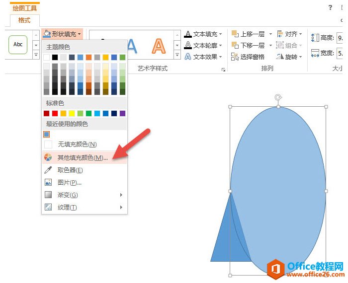 为了方便能够看清“相交“的位置,可以将椭圆设置为半透明状态。设置方法如下:选中椭圆,然后点击“形状填充—其他颜色填充“按钮。(下图箭头处)