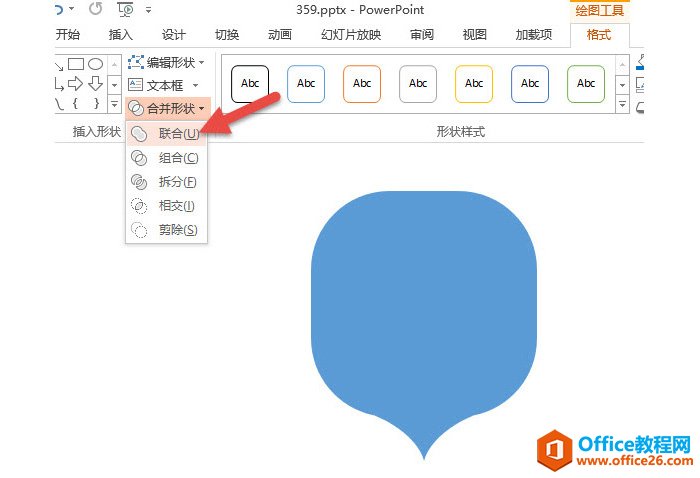 选中半透明椭圆,按住Ctrl+Shift键,再复制拖拽一个椭圆,同样相交到等腰三角形的另外一边,然后同时选中这三个图形,点击“合并形状—拆分”(下图箭头处)效果如下: