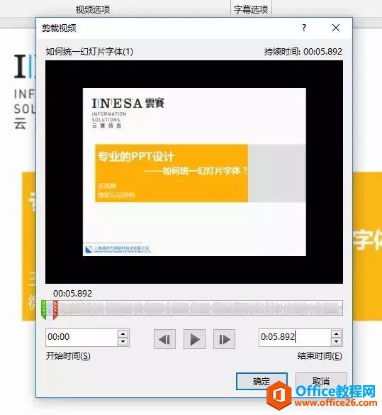 插入一个视频后,在【视频工具】—【播放】下,选择【剪裁视频】,就可以对视频进行剪裁编辑了。