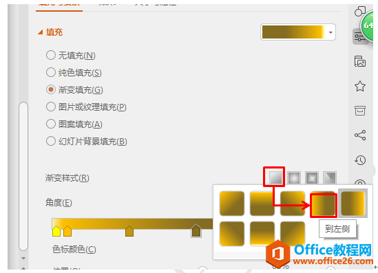 然后,在右侧的对象属性窗口下面,把填充色改成渐变色的黄色,渐变样式选择第一个选项下面的到左侧效果,色标颜色多添加几个相近的黄色,如图2
