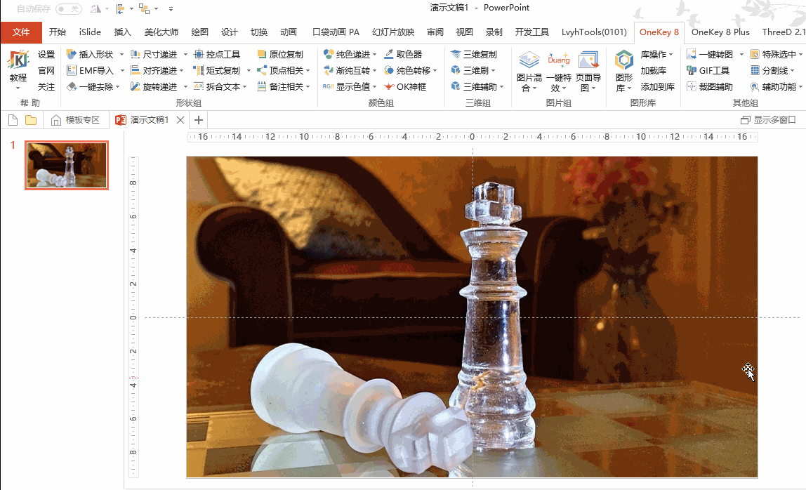 接下来复制图片,再复制出8张图片,要保证图片对齐。因为一般的复制粘贴是会发生位移的,所以这里我用OK插件的【原位复制】功能,选择图片后,通过点击「OK插件→原位复制」就可以快速复制出一张图,并与原图位置一致;同理,我再复制出7张图。