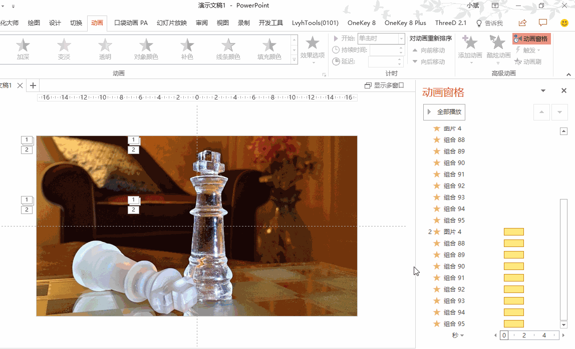 放大/缩小动画既可以放大,也可以缩小图片,所以可以先让图片发生一个反向变化的动画;不过,我们并不需要看到图片的这个变化过程,我们只需要这个过程的结果,而动画的持续时间不能为0,最少也得0.01s,所以我们可以再同时添加一个【出现】动画,来让图片出现得晚一点。所以,每个图片,分别需要添加3个动画。