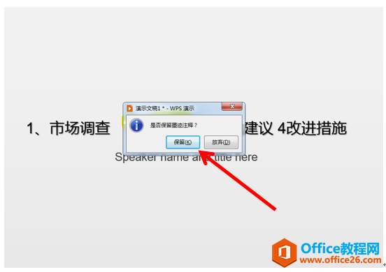 当我们需要返回幻灯片的编辑模式的时候,幻灯片会自动弹出对话框,询问“是否保留墨迹注释”,单击确定就可以了,如果不需要则单击放弃。
