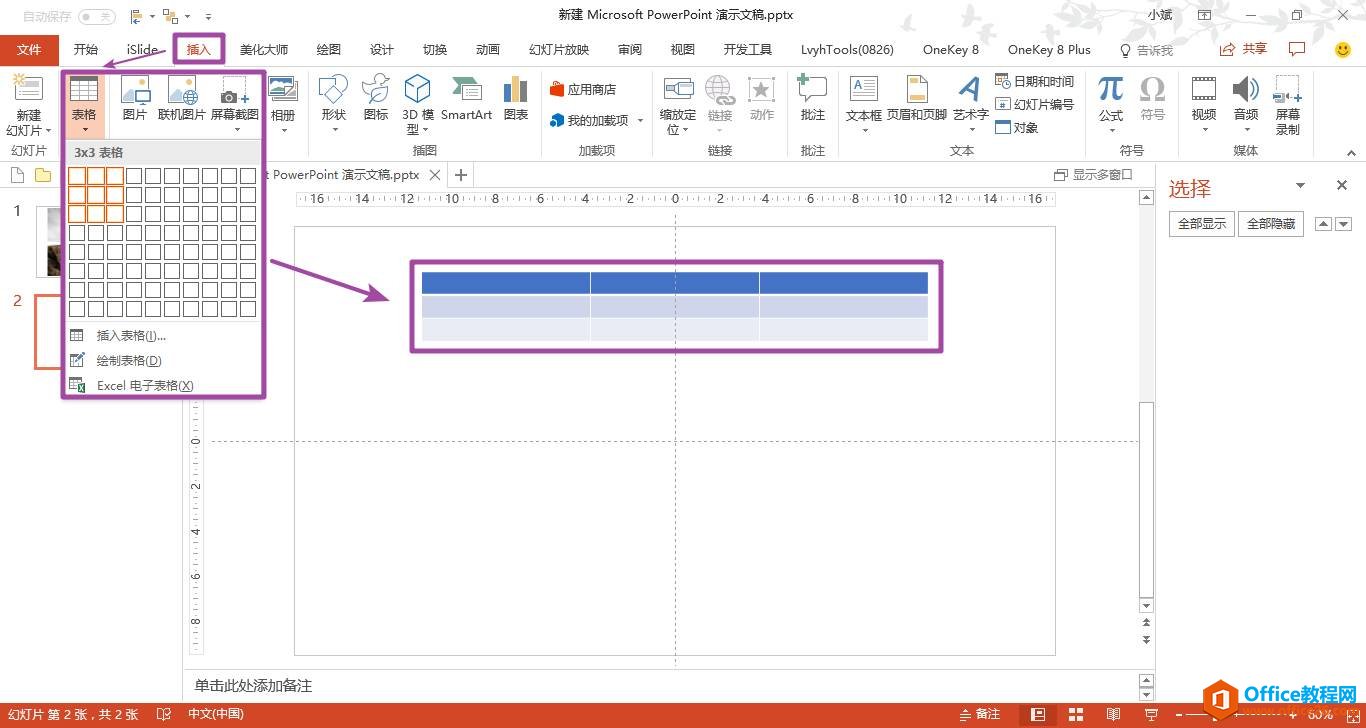 先插入一个表格,根据图片的数量确定表格的行数和列数,我打算插入3张图片,依次选择「插入」→「表格」,选择插入一个3×3的表格,再适当调整大小与位置。