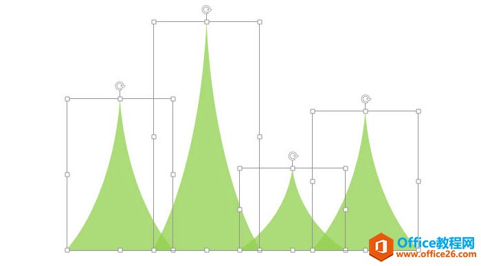 选中半透明椭圆,按住Ctrl+Shift键,再复制拖拽一个椭圆,同样相交到等腰三角形的另外一边,然后同时选中这三个图形,点击“合并形状—拆分”(下图箭头处)效果如下: