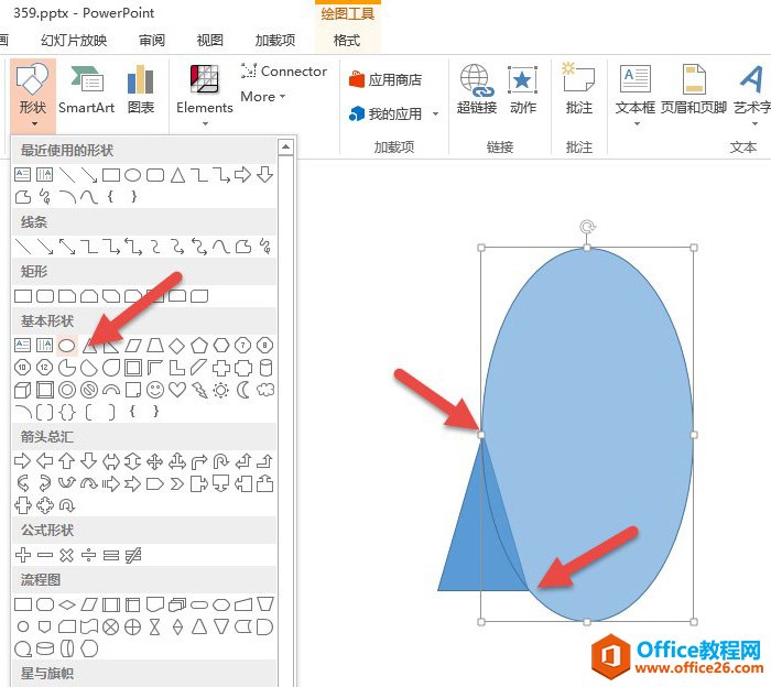接着插入一个椭圆形,椭圆要足够大,注意椭圆与等腰三角形的“相交”处。(下图箭头处)