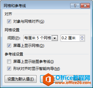 。随即将显示“网格和参考线”框。 注释 如果您想让“网格和参考线”对话框中的当前设置成为所有演示文稿的默认设置,请单击“设为默认值”。
