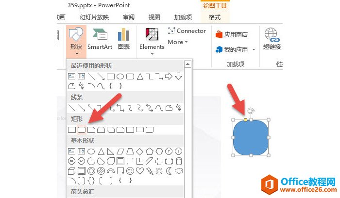 仔细观察你会发现,它是一个“圆角矩形+弧度三角形”组合而成。插入一个圆角矩形,并拖拽黄点到下图箭头所示位置。