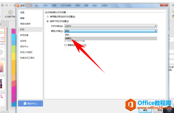 弹出选项的对话框,单击打印选项,选择使用下列打印设置,在颜色/灰度的下拉菜单当中选择纯黑白,单击确定。
