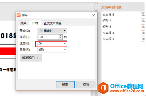 然后用鼠标双击动画效果,在弹出的对话框内选择计时,把速度改为5秒,如图: