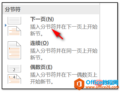 6、此时在上方的工具栏中找到并点击分节符下一页的命令;