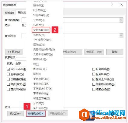 步骤4、如果要替换的内容为特殊字符,例如将文档中的全角省略号替换为段落标记。打开“查找和替换”对话框,将光标定位于“查找内容”文本框中后单击“特殊格式”按钮,在打开的快捷菜单中单击“全角省略号”选项,如图4所示。