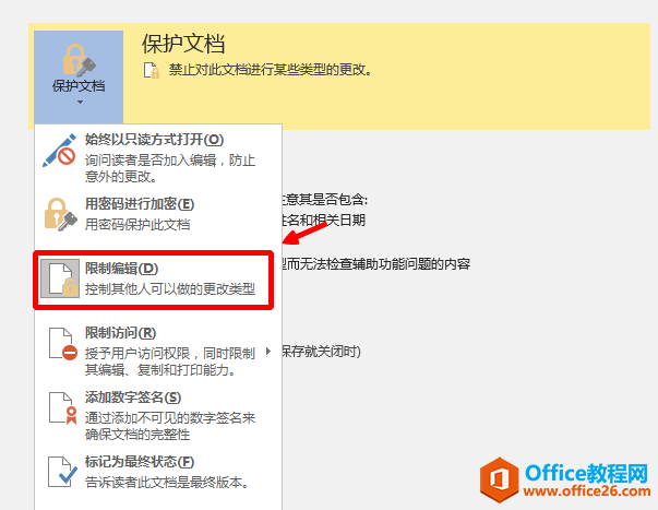 2.点击【保护文档】(黄色底纹表示文档被保护了)